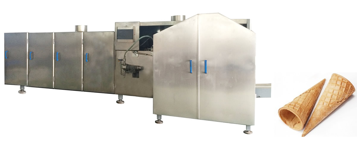 整臺(tái)機(jī)器由施耐德的PLC控制,通過(guò)主電機(jī)啟動(dòng),電磁閥啟動(dòng),風(fēng)機(jī)啟動(dòng),點(diǎn)火按住3秒鐘左右,點(diǎn)著火后對(duì)機(jī)器的烘烤板進(jìn)行加熱,待溫度顯示180度左右,將攪拌好的面漿由落料泵調(diào)定定量送到烘烤板底板上,并自動(dòng)合上烘烤板的面板,按調(diào)定的面餅厚度使面餅定形,然后主動(dòng)輪帶動(dòng)烘烤板轉(zhuǎn)入由上、下火嘴等組成的烘爐里烘烤,經(jīng)過(guò)烘烤后,面漿已成了面餅,由機(jī)械手準(zhǔn)確地把面餅塊送入卷模里卷成成品,脫模后把成品送出。